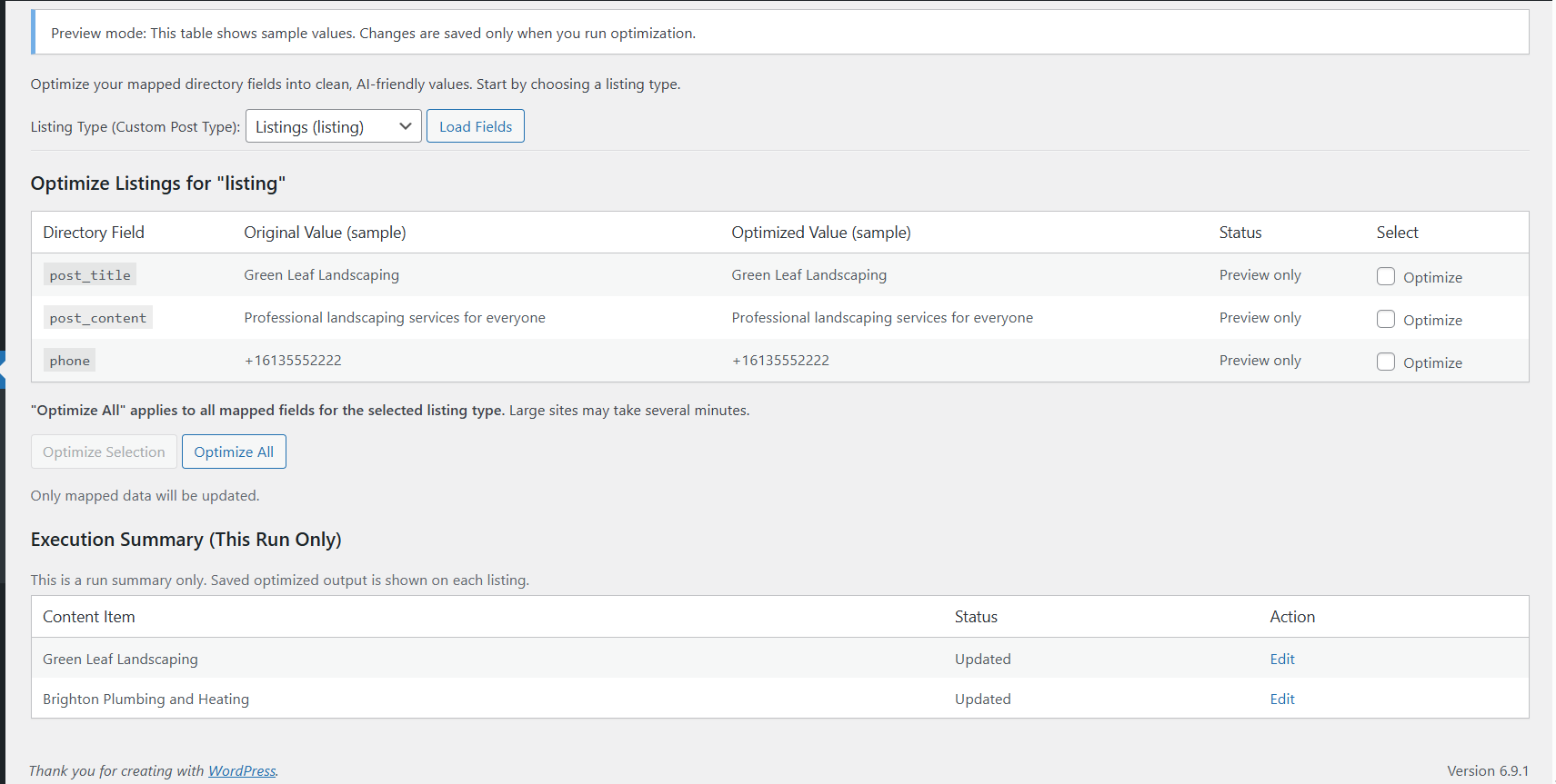 Generate normalized field values using AI and store them internally as structured post meta. Original listing content and custom fields remain unchanged.